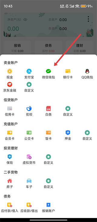 3、在弹出的账户列表中,选择【微信钱包】这类资金账户,开始设置具体信息哟。