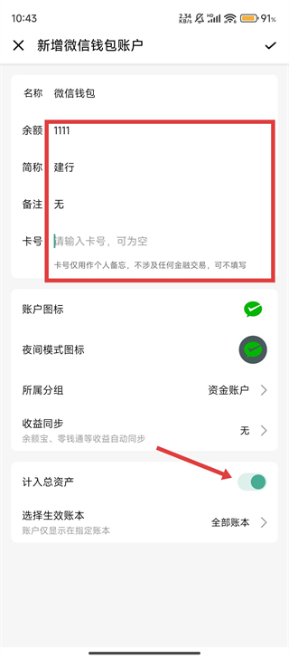 4、填写账户余额、简称等信息,开启【计入总资产】开关,再点击确认,总资产就设置好啦。