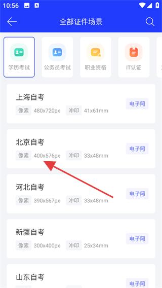 2、进入对应分类后选定具体证件类型(如北京自考)。