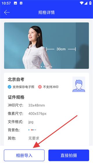 3、进入规格详情页,选择【相册导入】或【直接拍摄】获取照片素材。