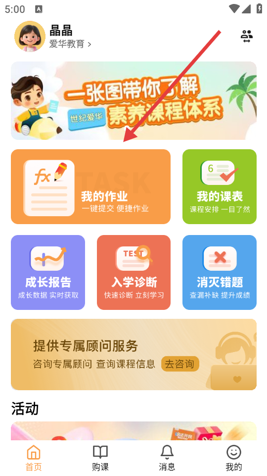 1、在首页,可查看我的作业、我的课表,还能获取成长报告、进行入学诊断等。