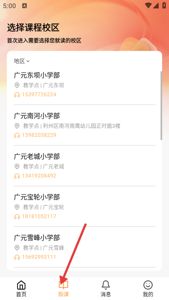2、点击【购课】,可选择课程校区,如广元宝轮小学部等。