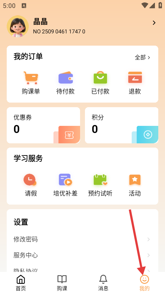 4、点击【我的】,可查看我的订单,使用请假、预约试听等学习服务,也能进行修改密码等设置操作。