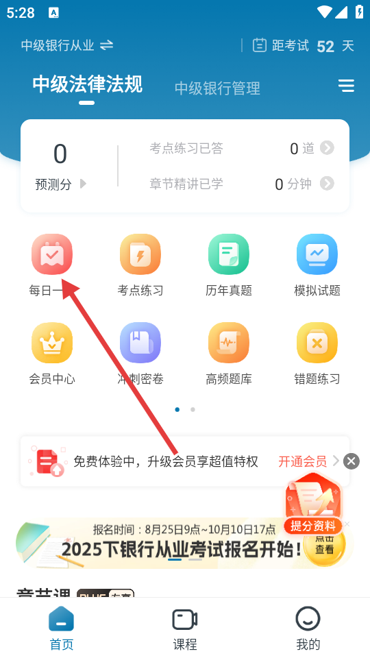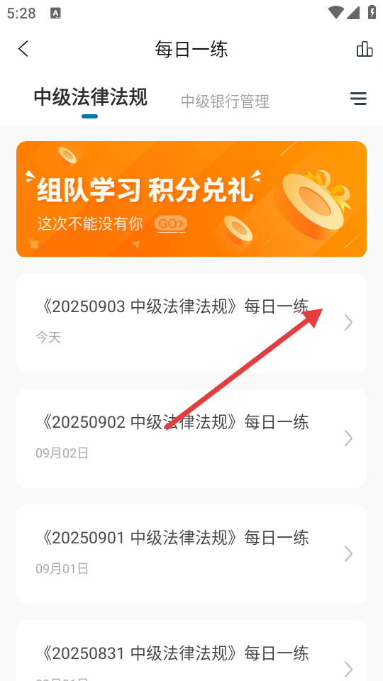 2、进入对应考试界面后,点击【每日一练】,选择当天的中级法律法规每日一练。