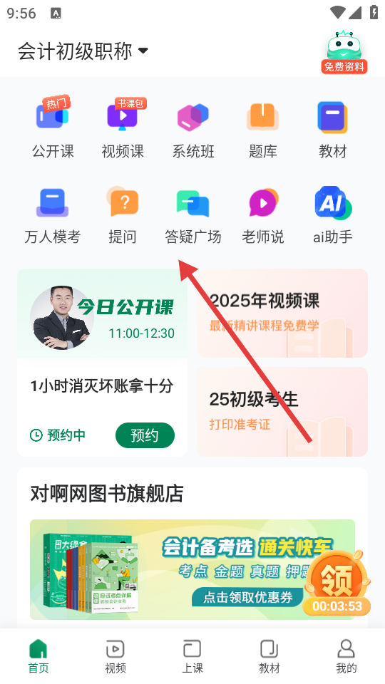 1、首页有【公开课】【视频课】【系统班】【题库】【教材】等功能板块,可按需使用。