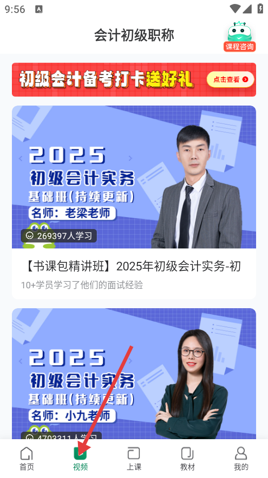 2、“视频”页面有会计初级职称相关课程,可进行课程学习。