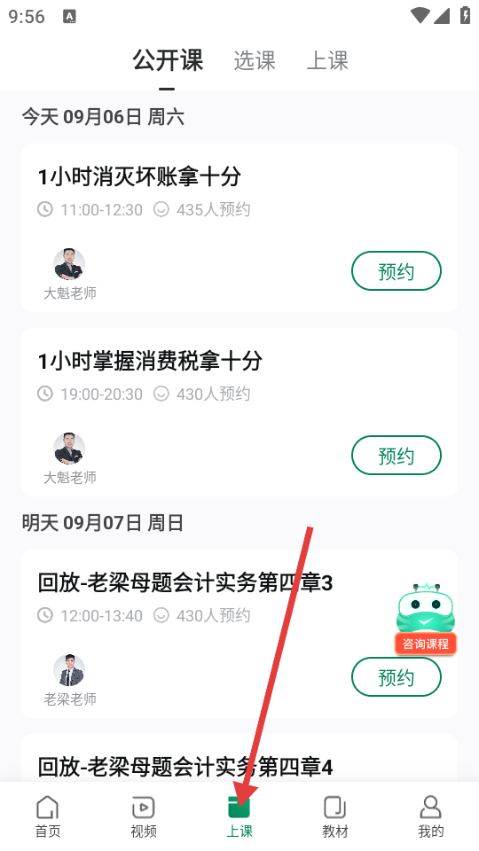 3、“上课”页面可查看公开课等课程安排,进行课程预约等操作。