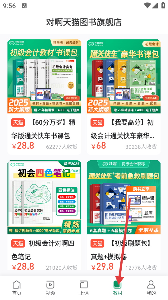 4、“教材”页面有“对啊天猫图书旗舰店”的会计初级职称相关教材等,可了解选购。