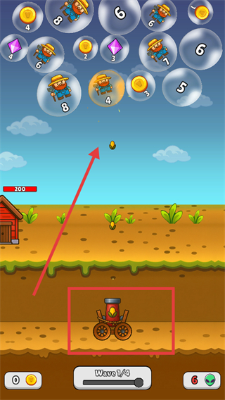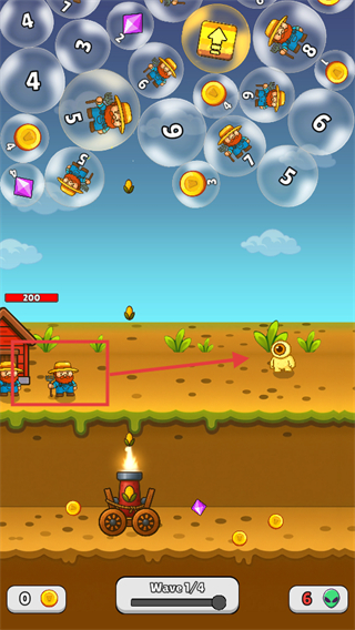 3、利用地面农夫角色协助攻击,瞄准外星泡泡进行消除,同时注意收集掉落的金币和宝石。