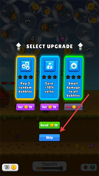 4、完成一波攻击后,在升级选择界面可选择泡泡爆破、金币收益或伤害提升等升级,也可点击【Skip】跳过升级继续游戏。