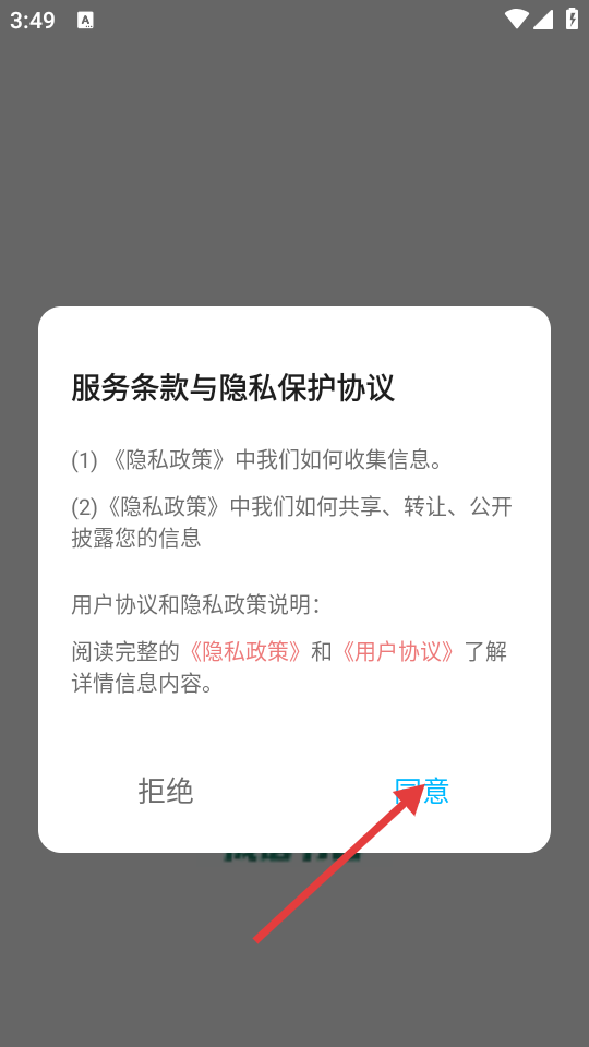 1、打开APP,进入服务条款与隐私保护协议页,勾选同意后点击【确认】按钮。