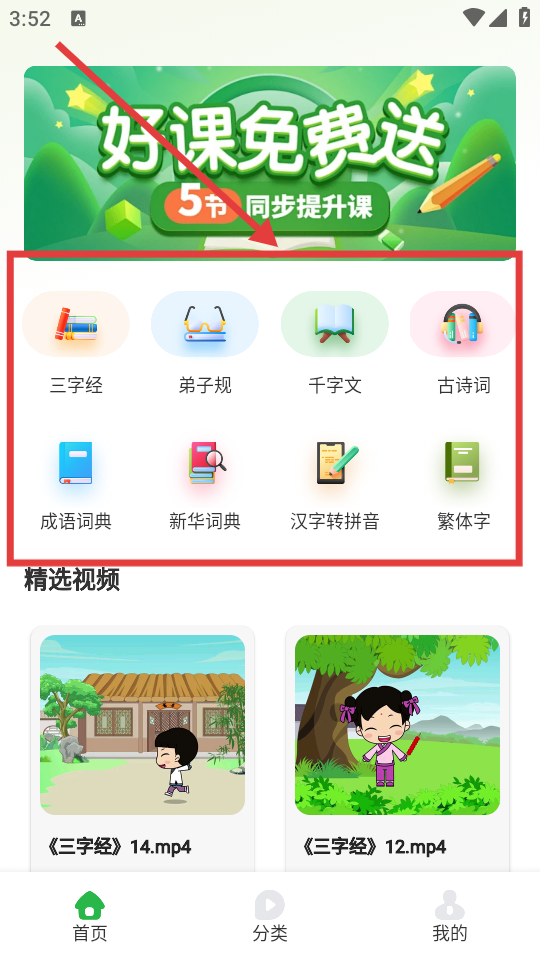 2、进入APP首页,可使用【三字经】【弟子规】等功能,进入对应传统文化内容学习页面。
