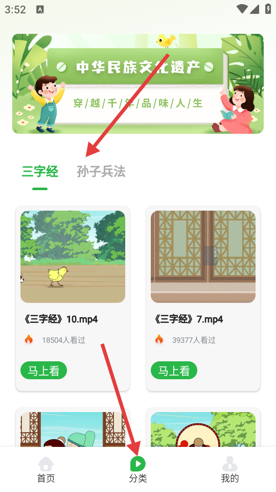 3、在分类页面,可查询【三字经】相关的教学视频,点击目标视频,即可播放学习传统文化知识。