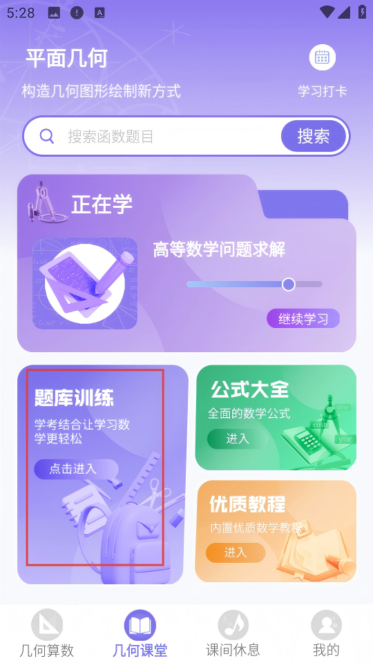 2、在几何课堂页面,点击【题库训练】,进入数学题库页面。
