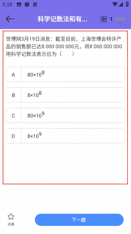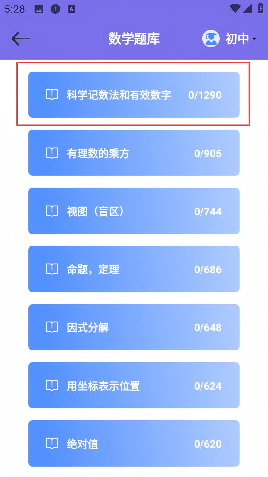 3、在数学题库页面,选择【科学记数法和有效数字】,进入该知识点的题目页面。