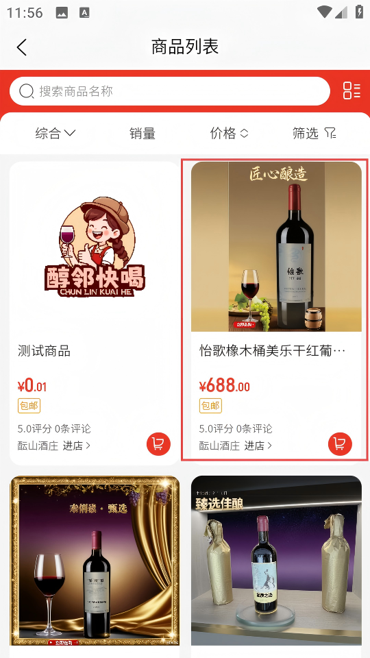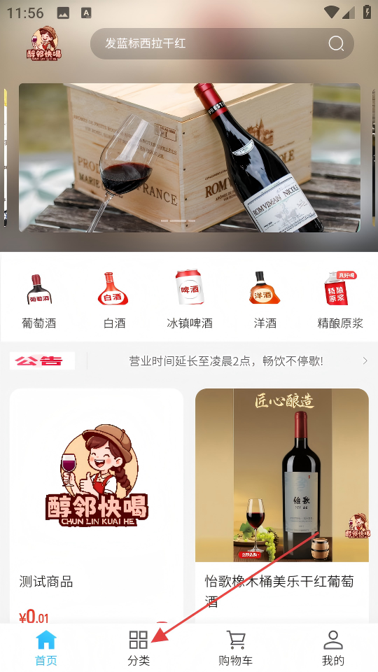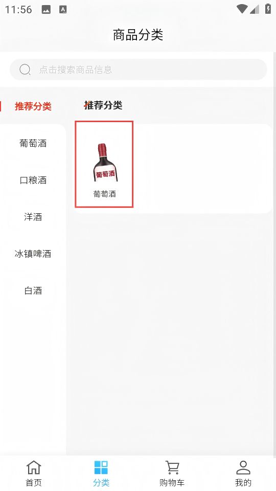 2、在商品分类页面,点击【葡萄酒】分类,进入葡萄酒商品列表页。