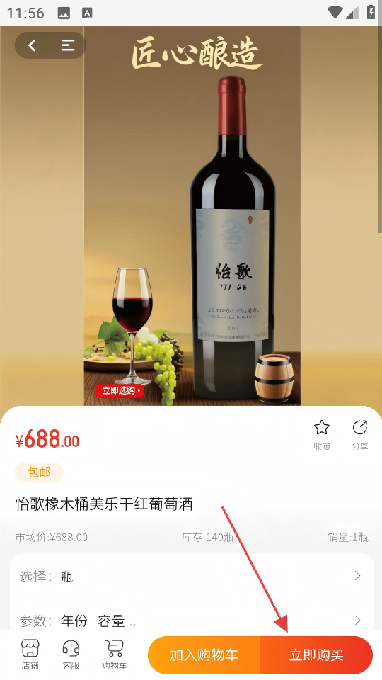 4、在商品详情页,点击【立即购买】,可进行该葡萄酒的购买操作。