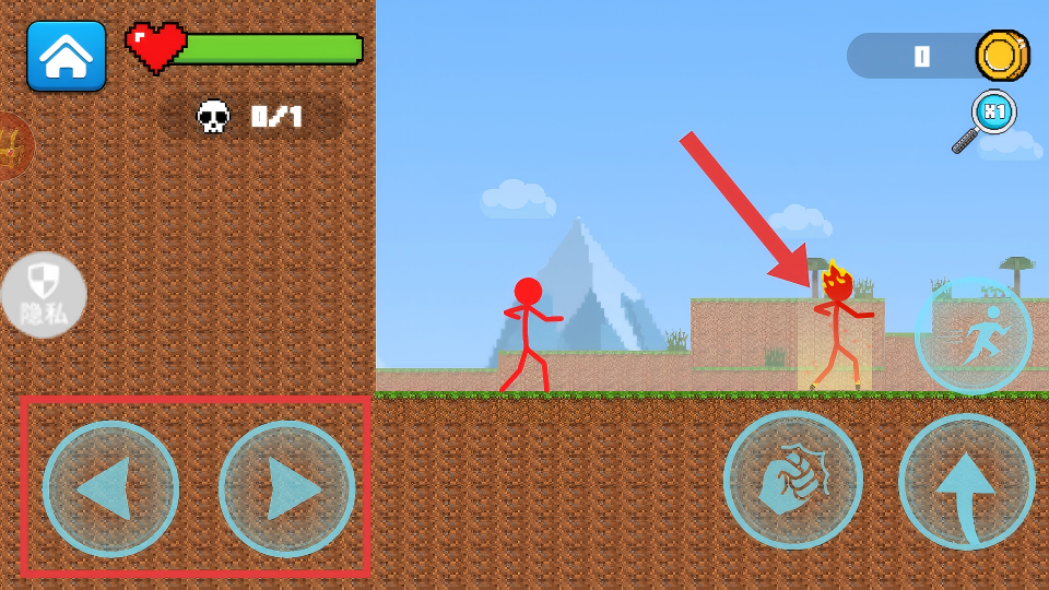 2、操控左下方红框内的【左右方向按钮】操控火柴人,移动至箭头位置【黄发火柴人】位置获得力量。