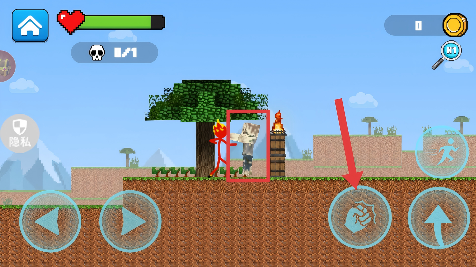 3、获取火焰能力后,遇到红框内【敌人】时,点击右下方【攻击按钮】进行攻击。