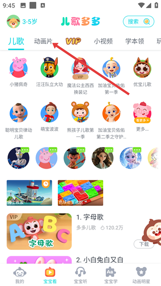 1、在首页中能够查看到丰富的儿歌、动画片进行观看。