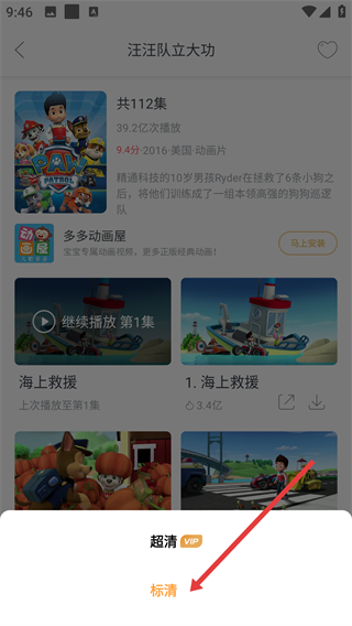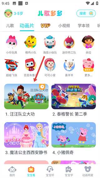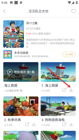 2、点击喜欢的动画页面,比如【汪汪队立大功】,就可以进入对应集数的视频入口啦。