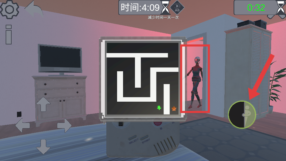4、时刻关注屏幕上方的【时间】显示,在恐怖伪人离开后,继续玩游戏机,满1分钟即可完成任务。