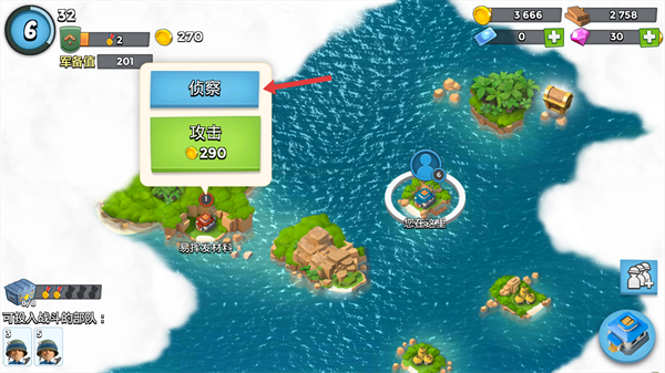 2、选择目标区域,点击【侦察】,提前了解敌方布局。