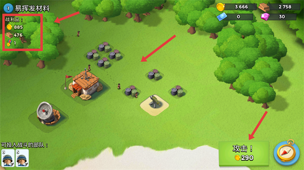 3、可查看【战利品】和敌方基地情况,确认攻打后,点击【攻击】,发起进攻。