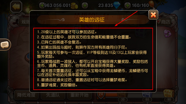 2、参与【英雄的远征】需【20】级以上英雄,远征中生命值不重置,阵亡英雄无法复活,需合理规划出战顺序。