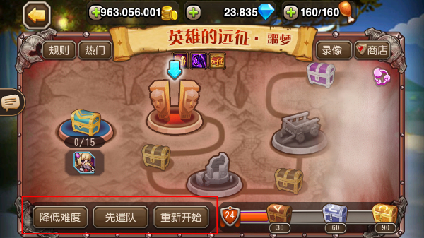 3、解锁【英雄的远征-噩梦】难度后,可使用【降低难度】或【先遣队】功能辅助挑战,提升通关效率。