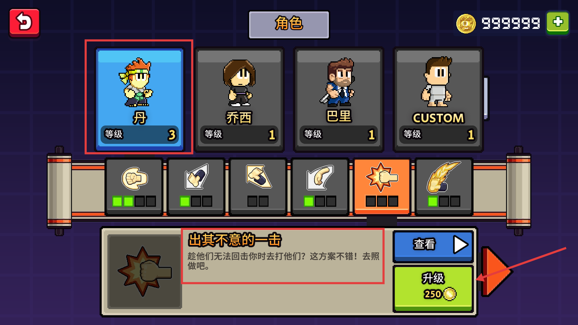 2、选择高等级的【丹】角色,优先升级【出其不意的一击】技能,提升战斗实力,应对关卡中的敌人。