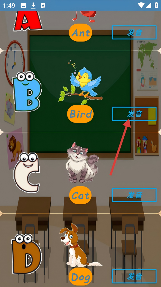 4、在英语字母学习页,点击【Bird】旁的【发音】按钮,可听该单词发音。