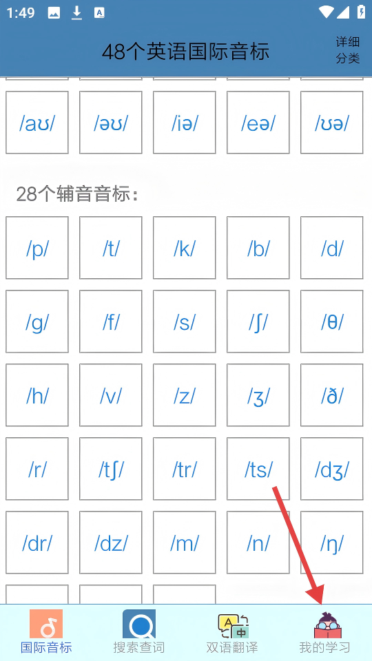1、在音标页面,点击右下角【我的学习】,进入学习内容页。