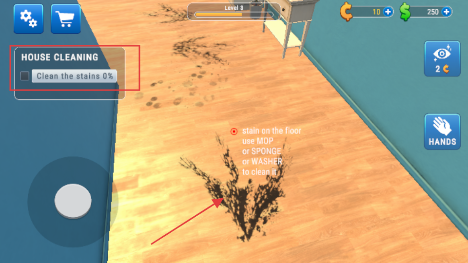 2、进入房屋后,查看任务进度条,针对地面污渍,可使用相对的工具进行清理。