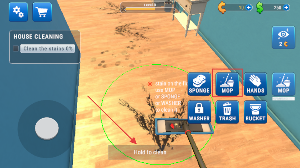 3、选择【MOP】工具,按住【Holdtoclean】按钮清理地面污渍,逐步推进清洁进度。