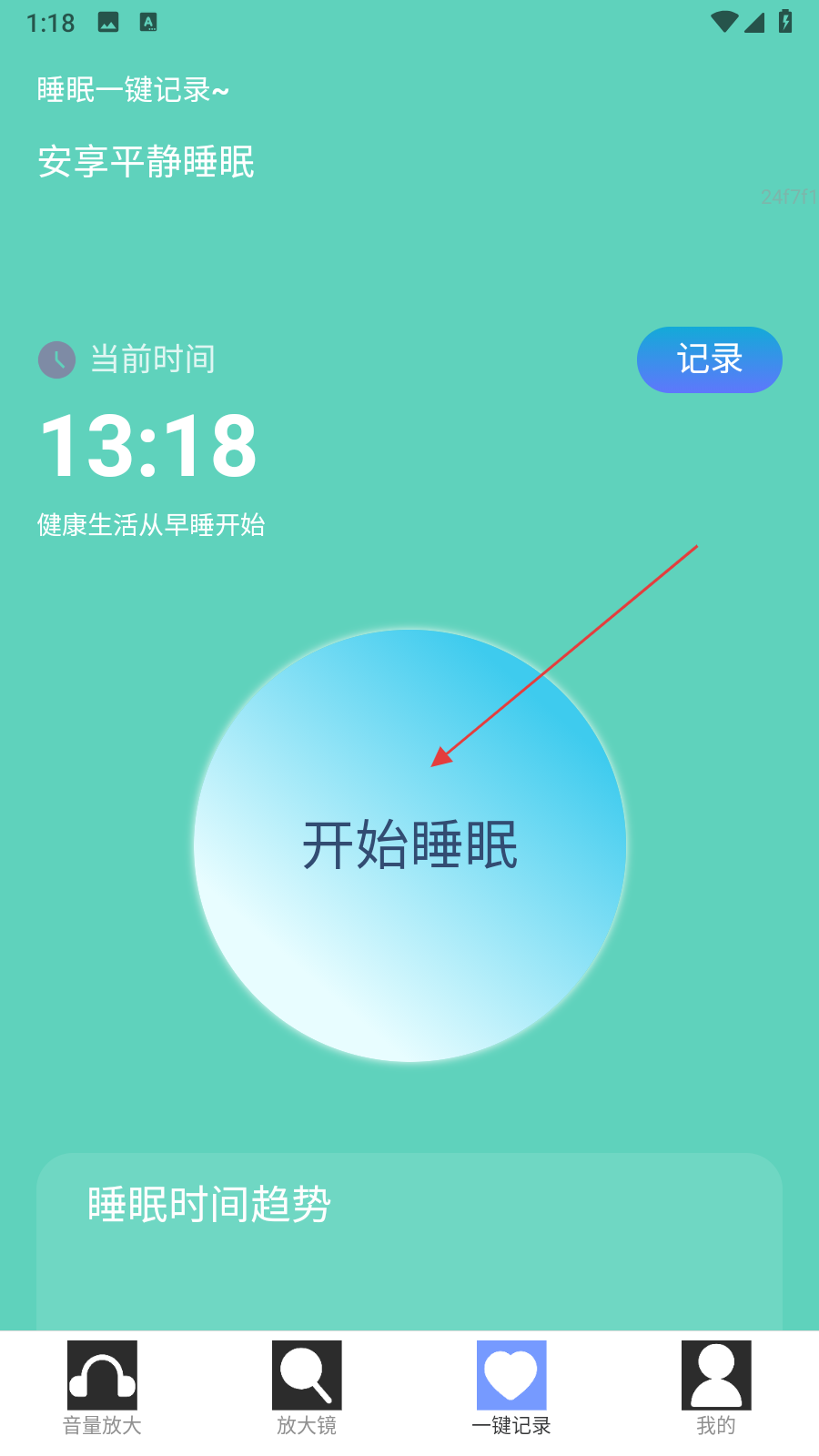 1、进入应用,点击底部【一键记录】,进入睡眠记录页面。