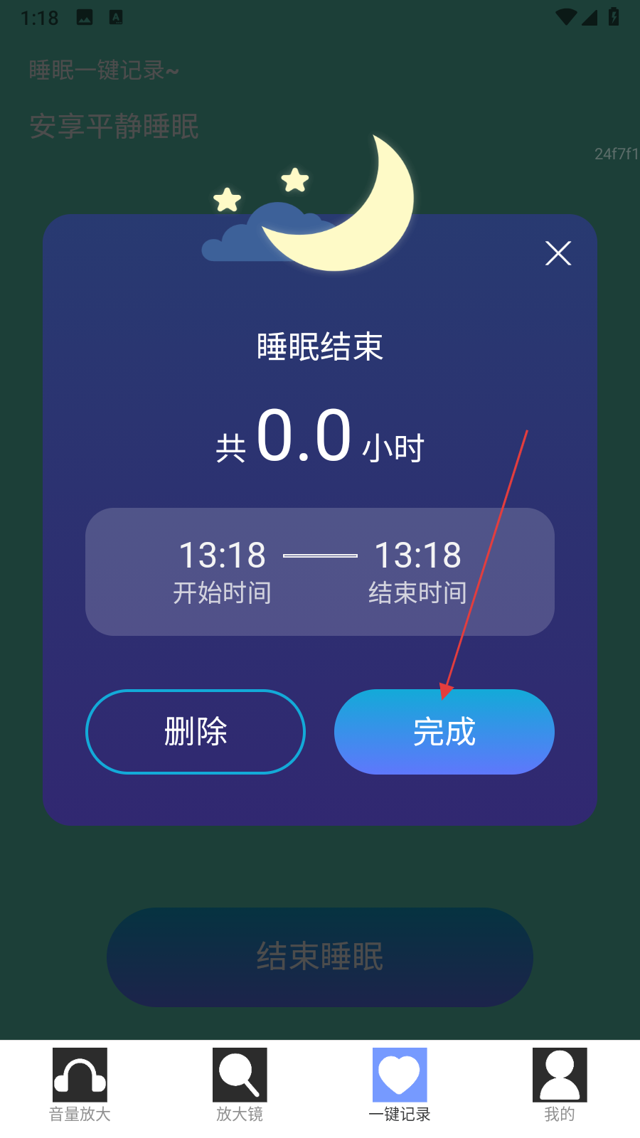 4、最后点击【完成】,即可保存此次睡眠记录,查看睡眠时长等信息。