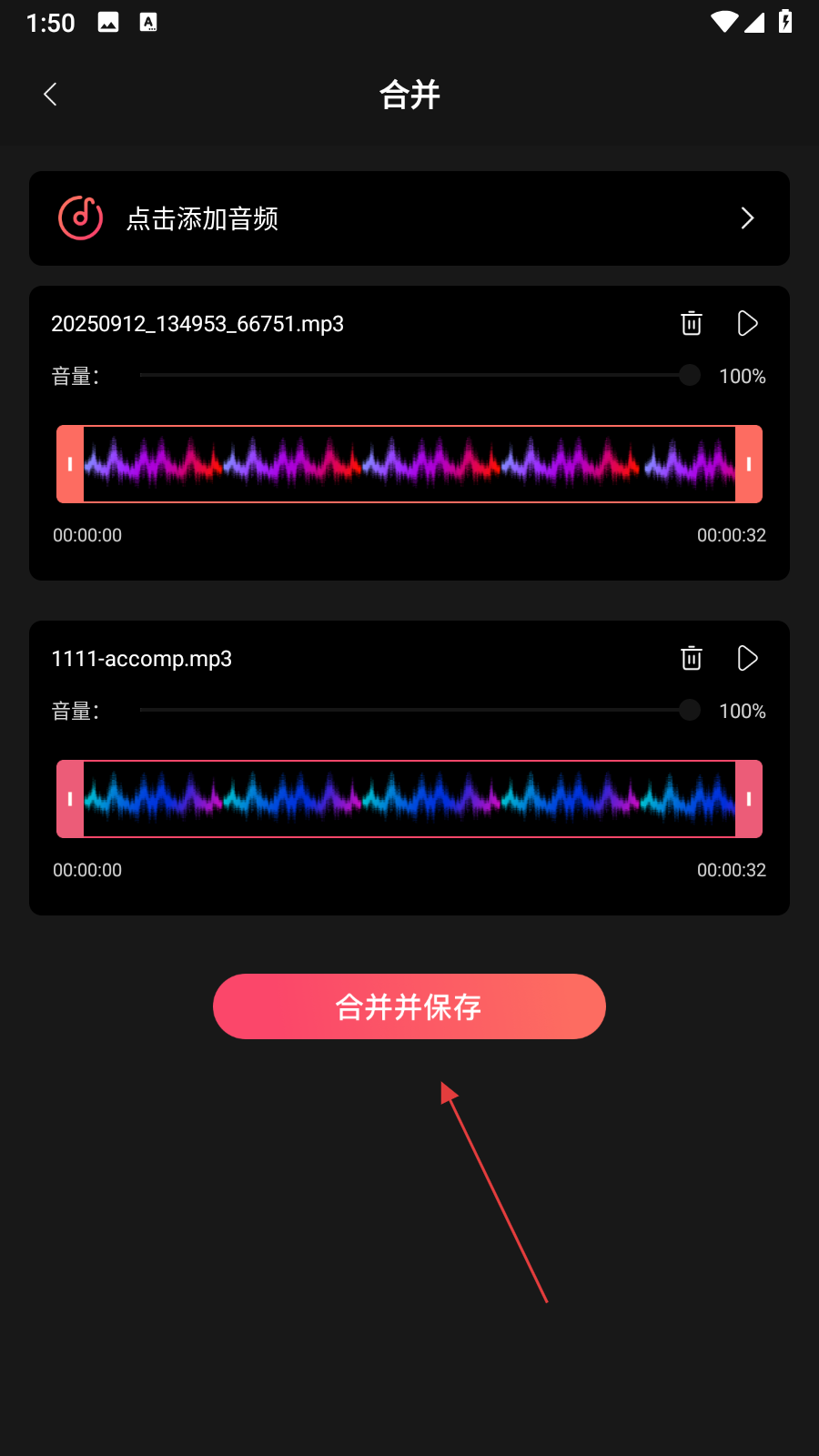4、音频添加完成后,点击【合并并保存】,即可完成多个音频的合并操作。