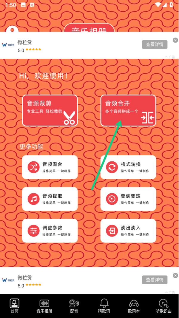 1、进入首页,点击【音频合并】,进入音频合并操作页面。