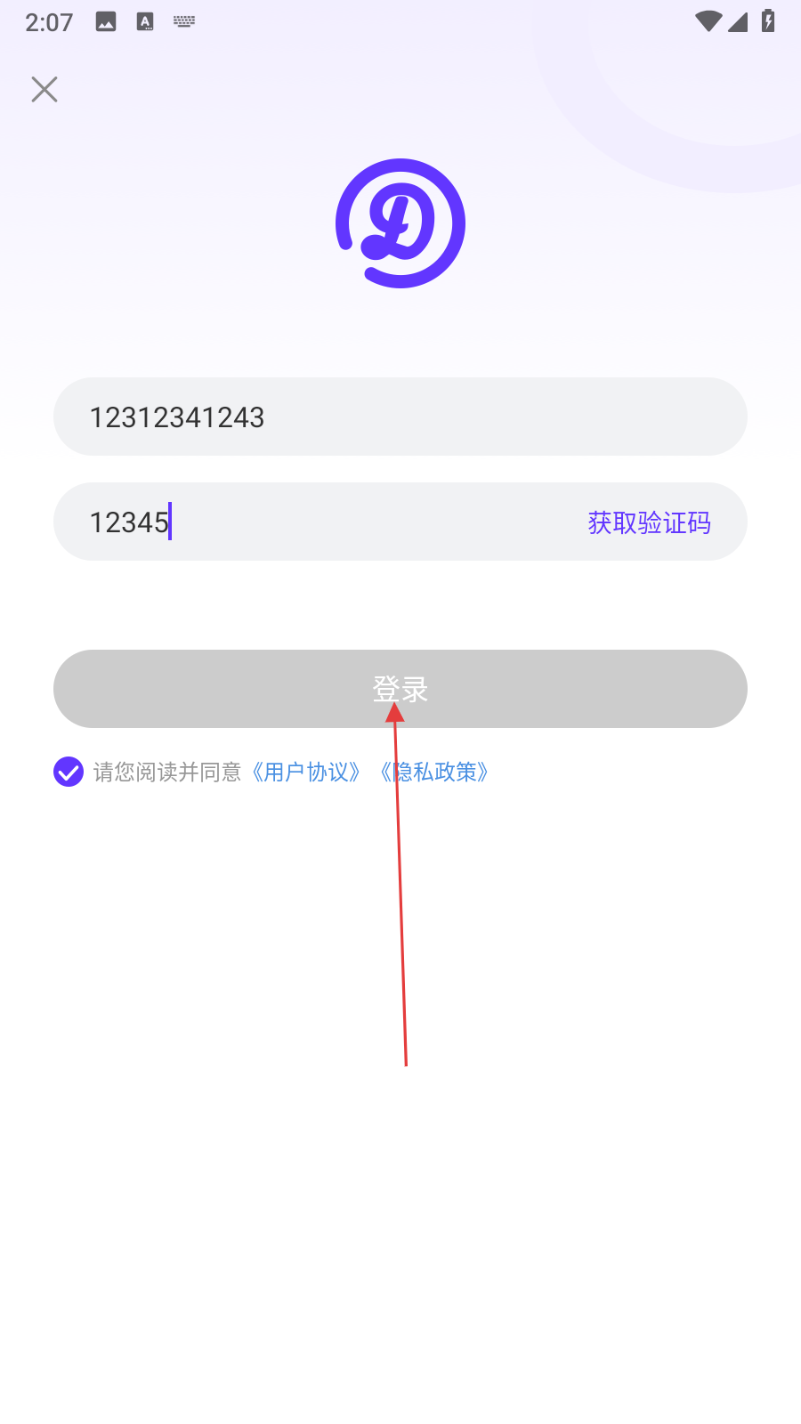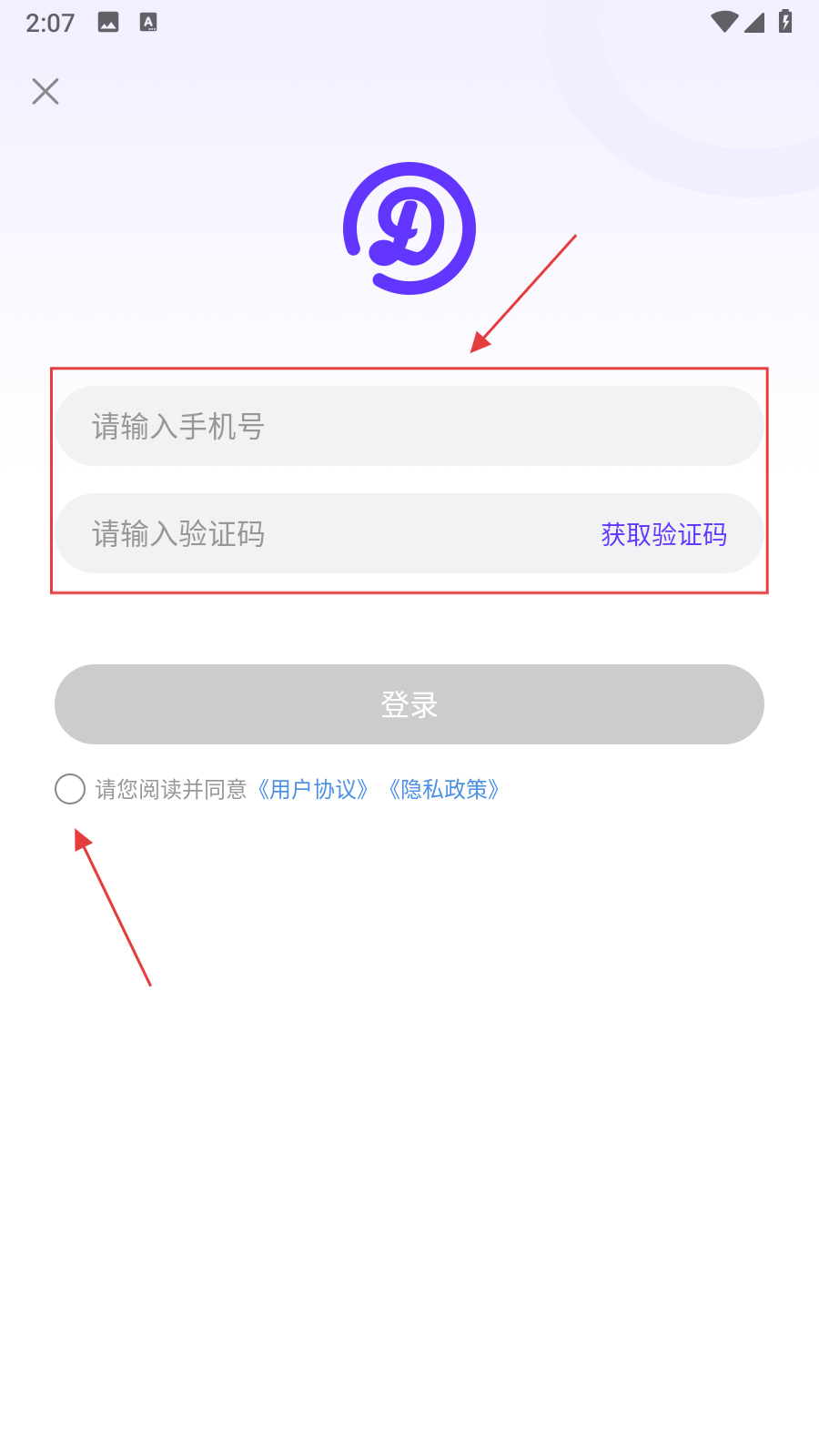 3、在登录界面,勾选【同意协议】,输入【手机号与验证码】。