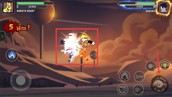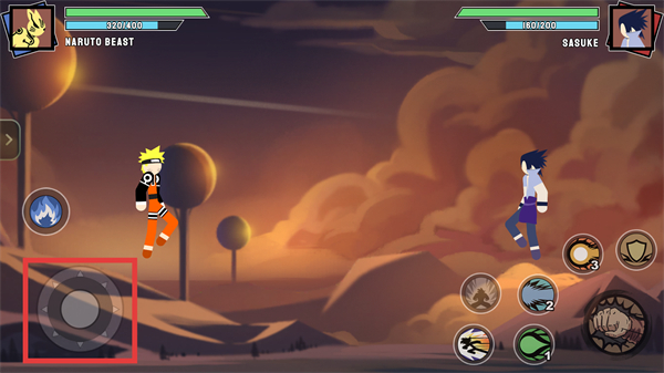 1、操控红框内的【NARUTO】移动键控制角色,配合右侧技能键,与【SASUKE】展开格斗,消耗其血量。