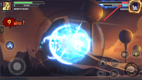 3、持续连招达成【9-Hits】,释放全屏技能攻击敌方,快速压低其剩余血量,推进对战胜利。