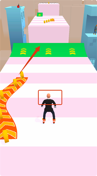 2、游戏中操控角色前进,通过绿色加速带提升速度,注意躲避障碍物,同时继续收集金币。
