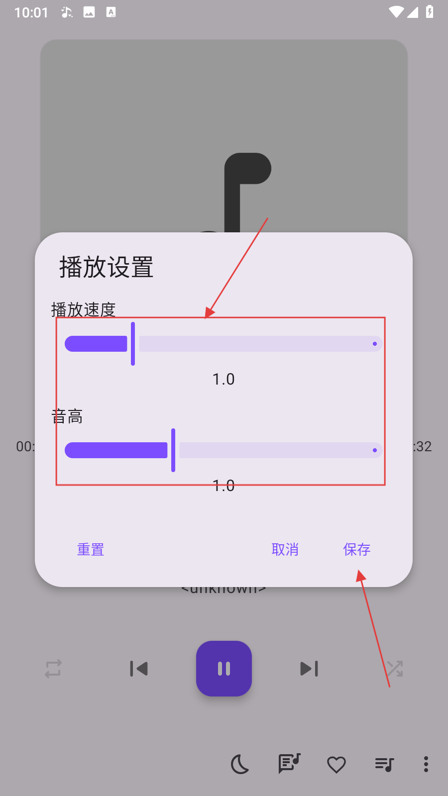 4、在播放设置界面,拖动滑块【调整播放速度和音高】,调整好后点击【保存】即可。