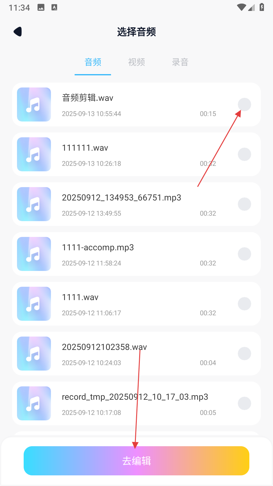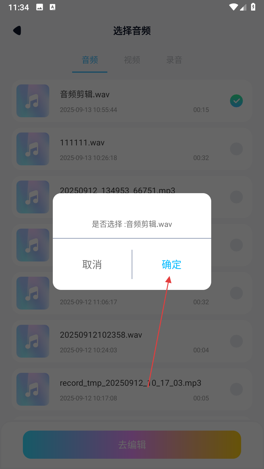 2、在选择音频页面,勾选要倒放的音频,点击【去编辑】。