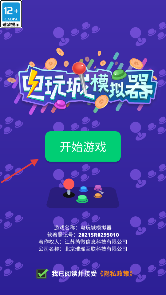 1、勾选【我已阅读并接受-《隐私政策》】,点击【开始游戏】,正式开启电玩城经营之旅。