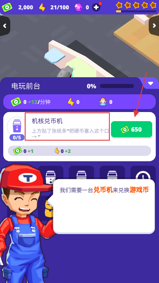 2、在电玩前台界面,花费【650】游戏币购买【机核兑币机】,解锁兑币功能以兑换游戏币。