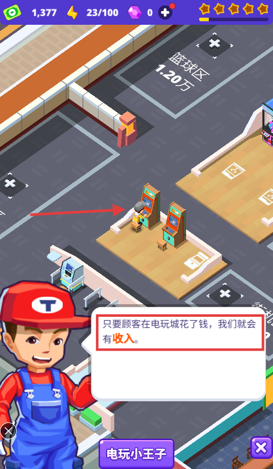3、吸引顾客到电玩城游玩消费,顾客花钱即可产生收入,可通过升级设施来增加客源。