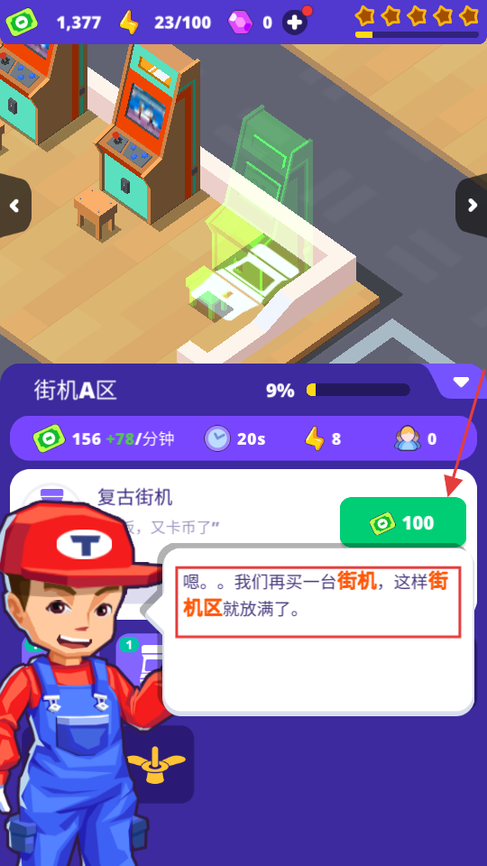 4、在街机A区,花费【100】游戏币购买【复古街机】,填满街机区以提升区域收益。