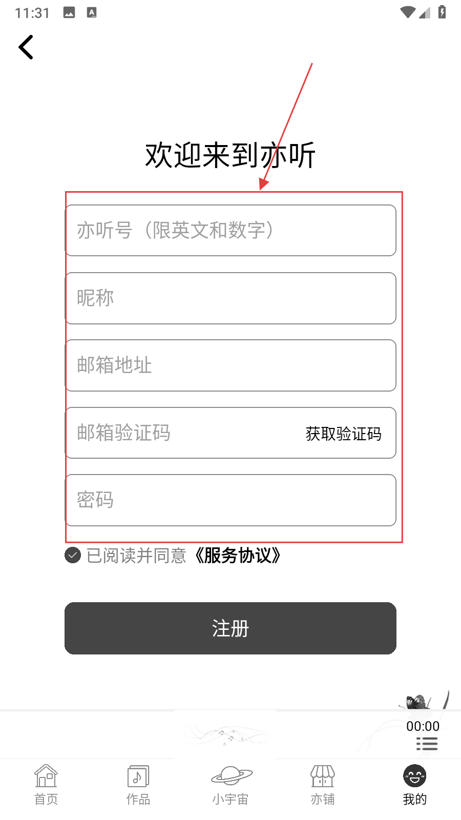 3、在注册信息填写页面,依次【填入亦听号、昵称、邮箱地址】等信息。